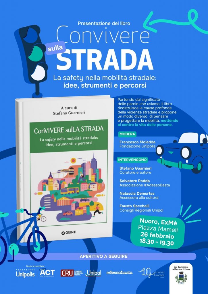 Il 26 febbraio a Nuoro alle 18.30, presso ExMè – piazza Mameli, sarà presentato ConVIVERE sulla strada. La «safety» nella mobilità stradale: idee, strumenti e percorsi, il volume curato da Stefano Guarnieri (edito da Giunti) che sta diventando uno strumento chiave per ripensare l’educazione alla mobilità in Italia. Oltre all’autore, interverranno: Natascia Demurtas, Vicesindaca di Nuoro e Assessora alla cultura; Salvatore Podda in rappresentanza dell’Associazione nuorese AdessoBasta e Fausto Sacchelli, Responsabile nazionale dei Consigli Regionali Unipol. Modera: Francesco Moledda di Fondazione Unipolis. L’iniziativa è patrocinata dal Comune di Nuoro.
